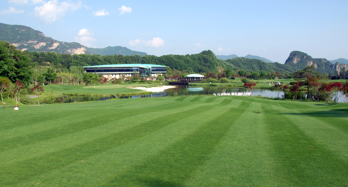 티샷은 26m 하향인 반면 F/W 양쪽이 숲이고, 특히 우측은 계류가 있어 장타도 중요하지만 O.B도 주의해야한다. Last hole인만큼 긴장을 늦추면 곤란해진다.